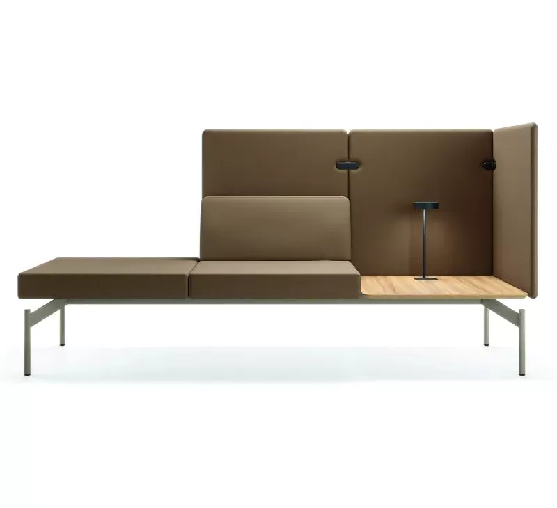 O sistema Float é composto por uma base técnica única, sobre a qual são integrados os demais componentes: módulos estofados, mesas de apoio, painéis de privacidade e acessórios.