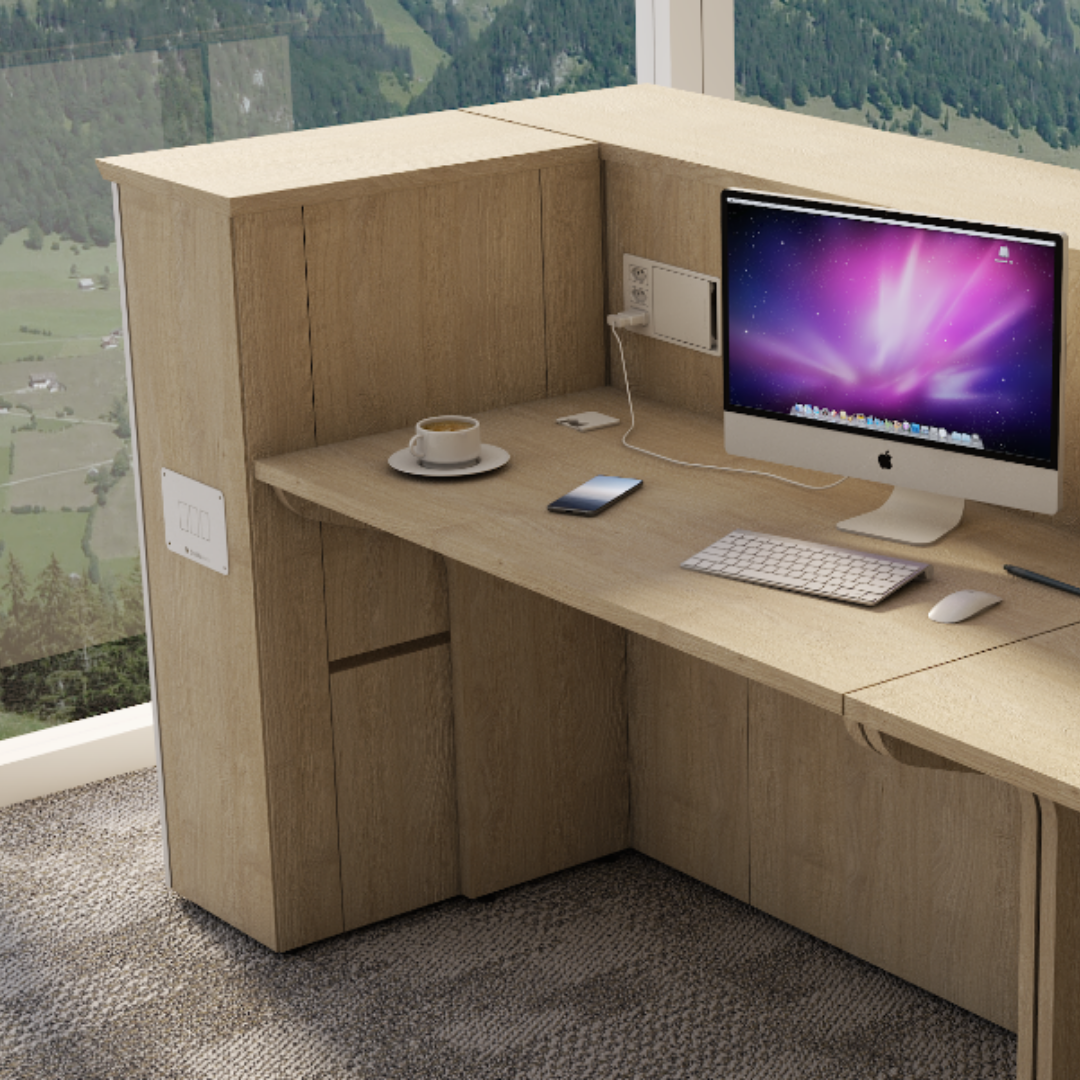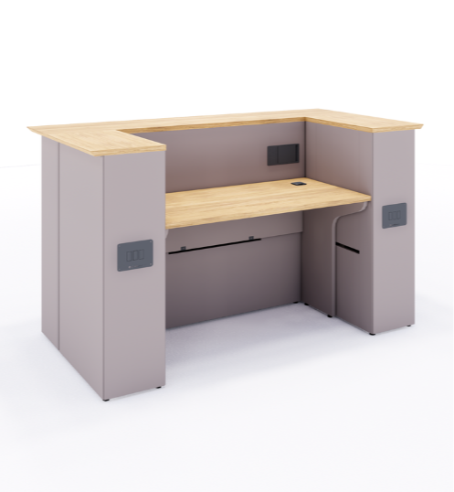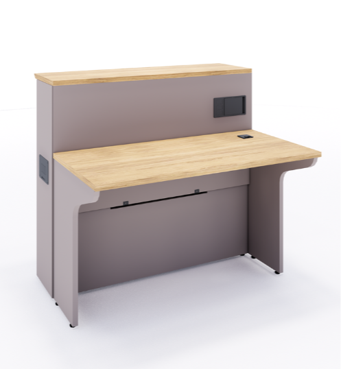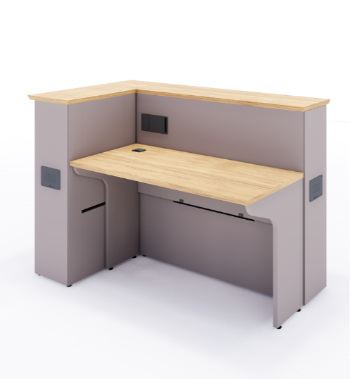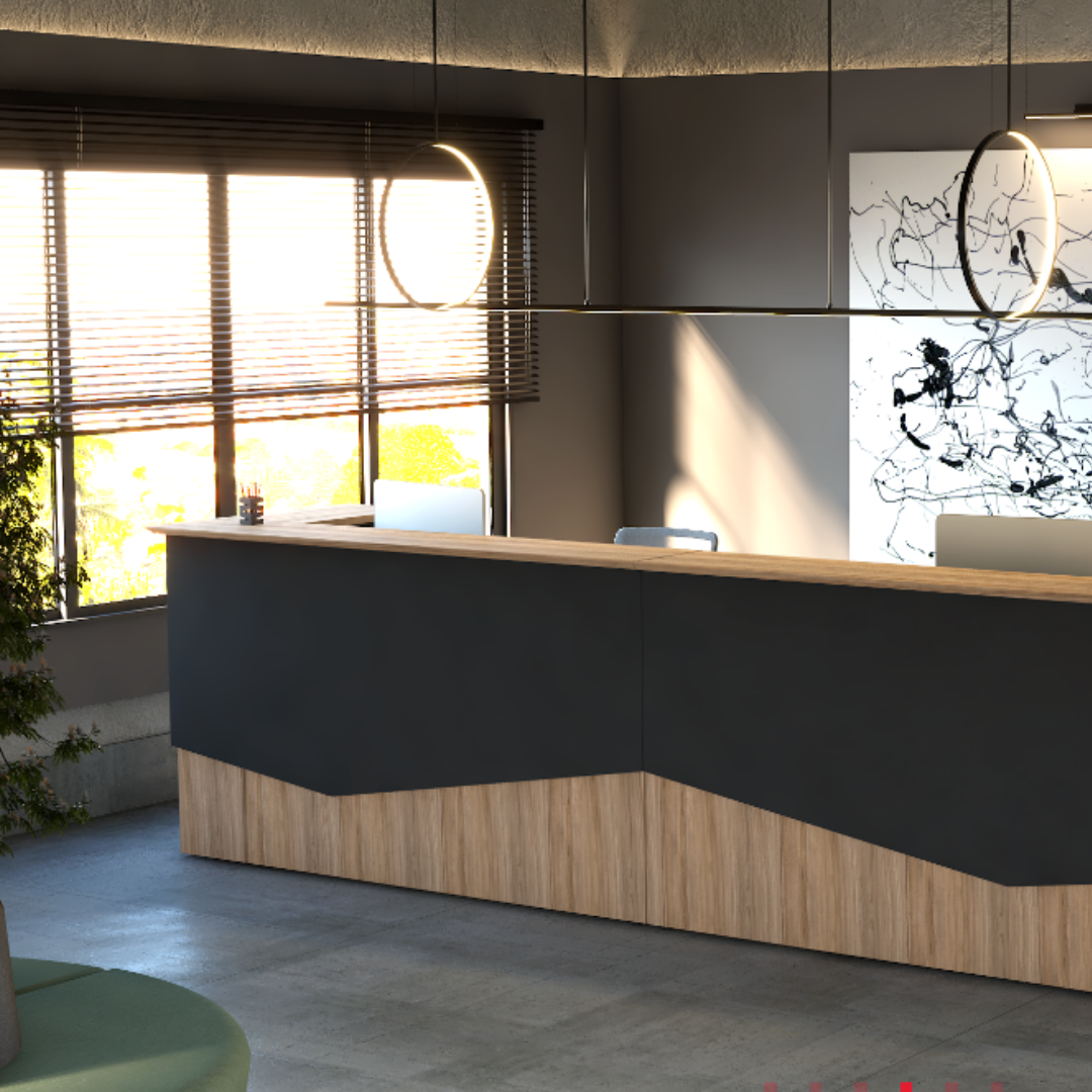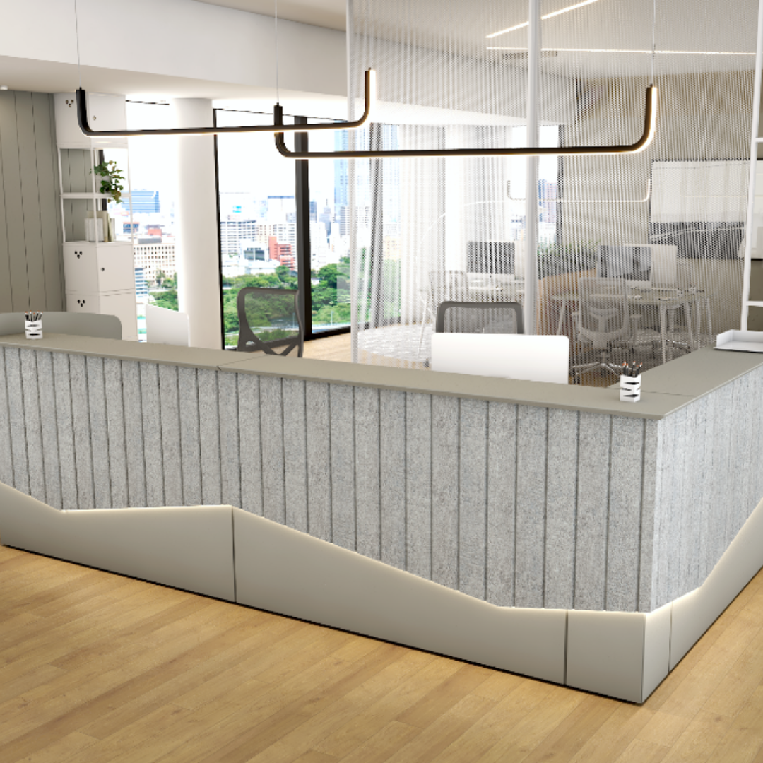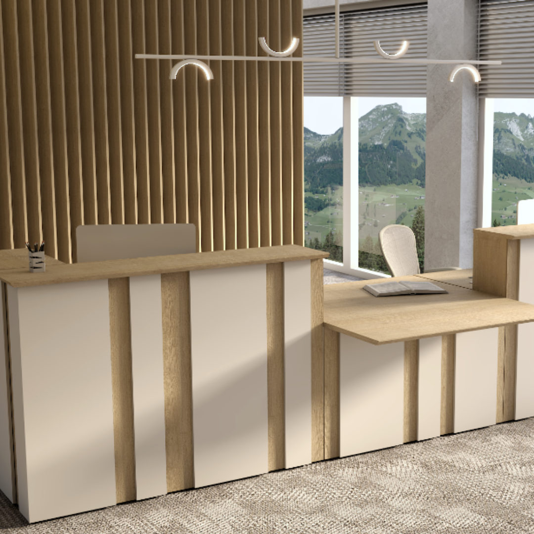 Essa linha oferece uma ampla variedade de balcões de atendimento — em versões retangulares, angulares, altos, baixos, individuais e adaptados para acessibilidade (PNE). Os modelos podem ser complementados com apliques frontais orgânicos, painéis laterais e iluminação em LED, criando composições elegantes e acolhedoras para áreas de recepção.