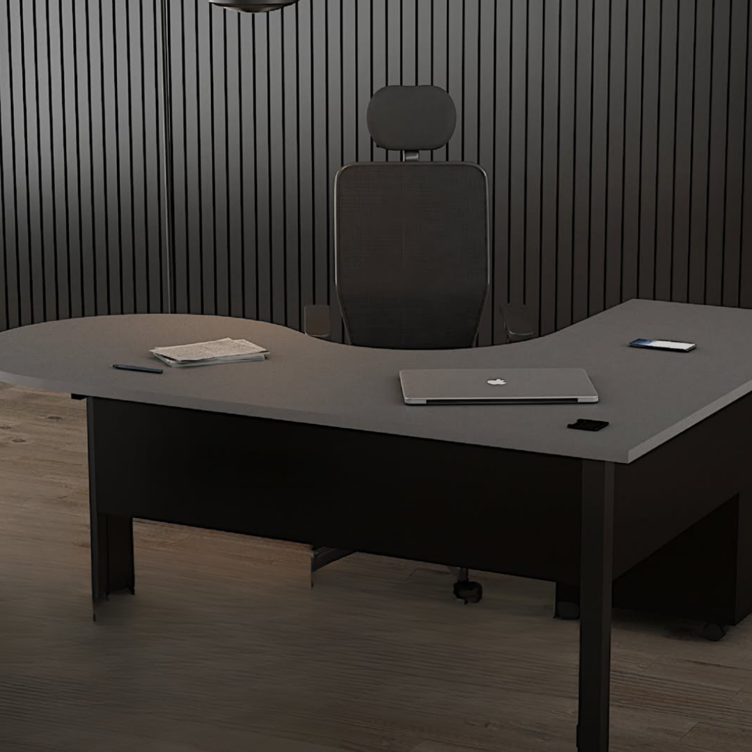 Sofisticação e funcionalidade se encontram nesta mesa angular com pé painel esquerdo. Seu design fluido e robusto oferece conforto visual e excelente aproveitamento de espaço, ideal para ambientes de liderança que exigem presença e praticidade. O painel lateral confere elegância e privacidade, enquanto a ampla superfície de trabalho garante produtividade com estilo.