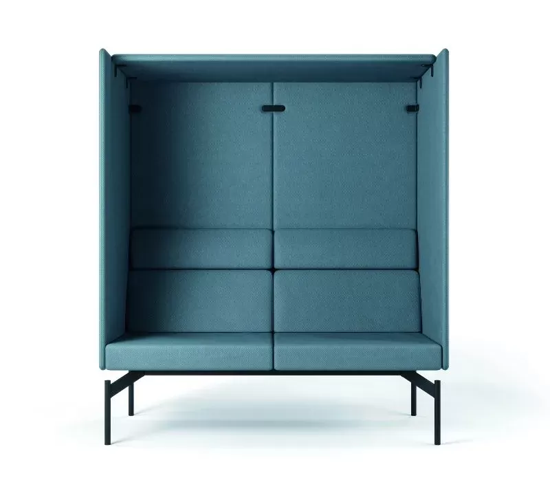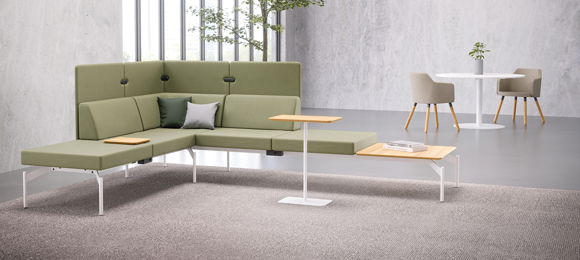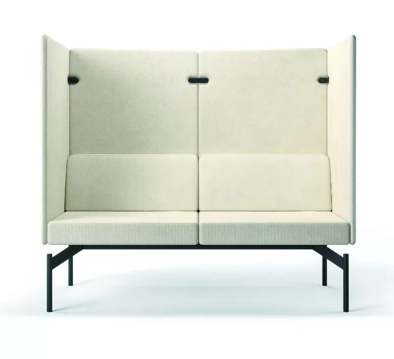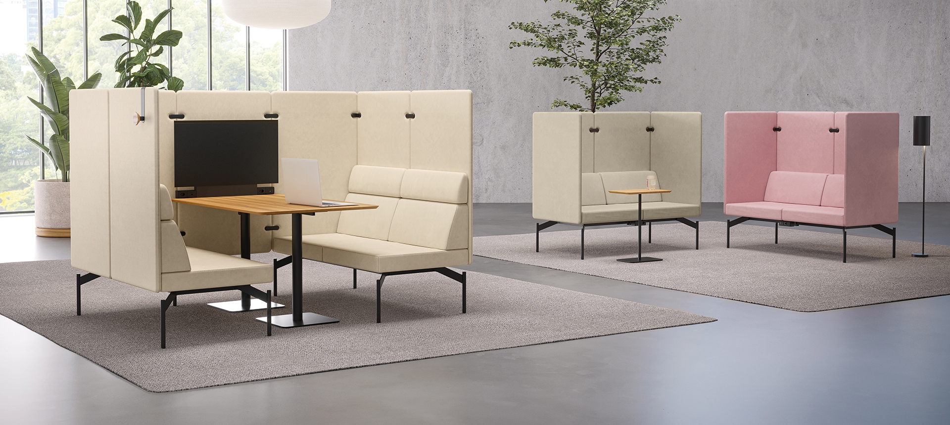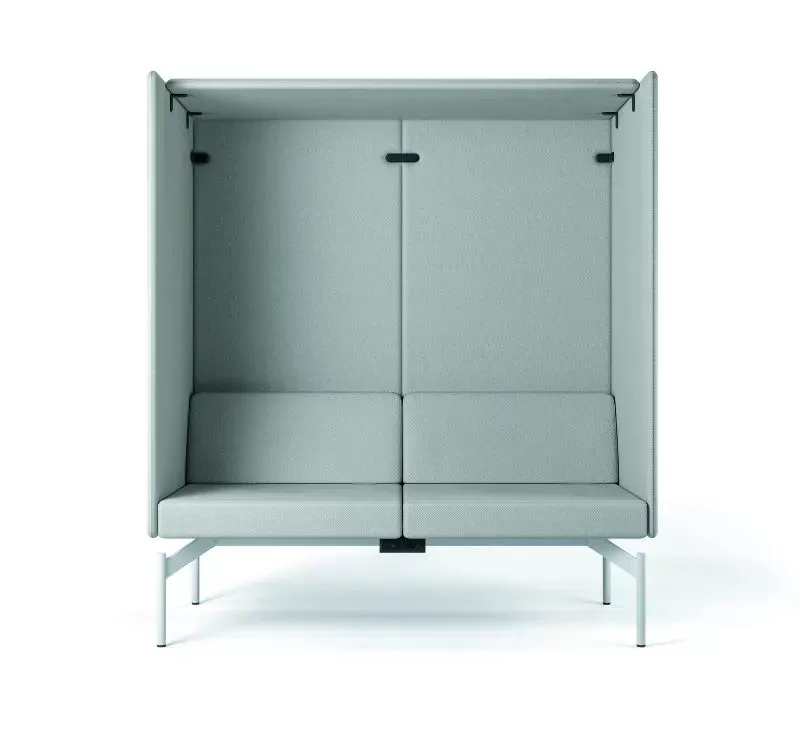 O sistema Float é composto por uma base técnica única, sobre a qual são integrados os demais componentes: módulos estofados, mesas de apoio, painéis de privacidade e acessórios.