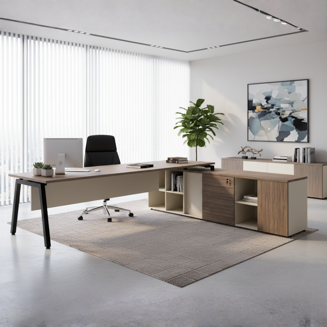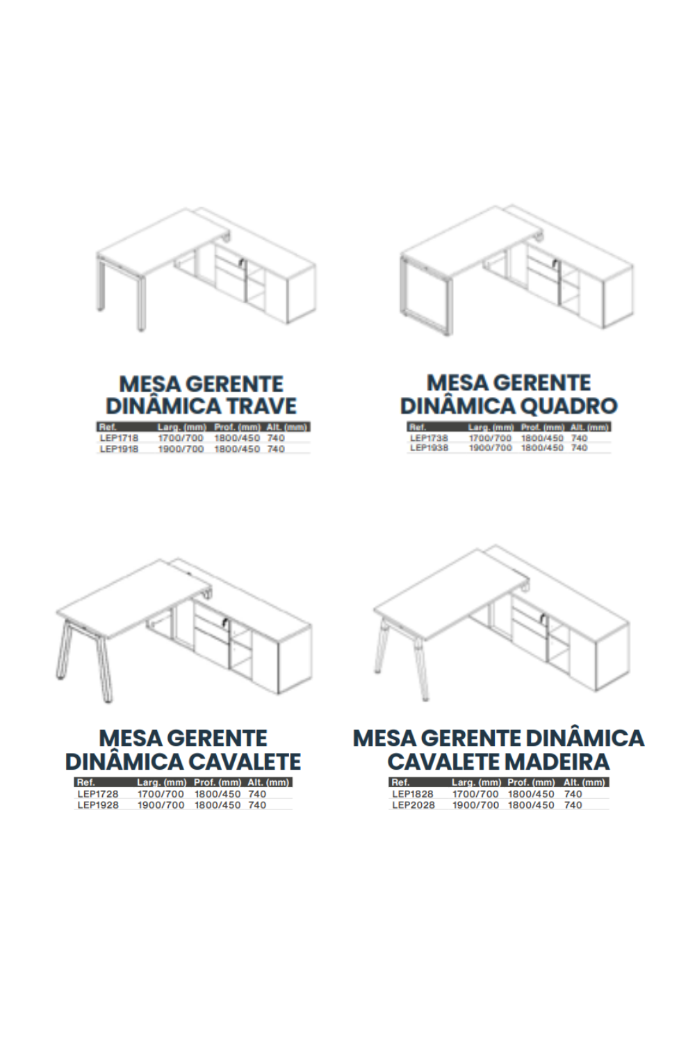 Projetadas para escritórios de liderança, essas mesas oferecem design contemporâneo, estrutura robusta e componentes integrados como armários com gavetas, nichos e portas. Os modelos variam entre pés metálicos tipo cavalete, cavalete em madeira, quadro e trave — cada um com características visuais e funcionais distintas, mas todos mantendo a elegância e a eficiência que a linha Lexus propõe